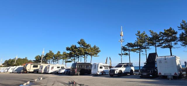 2026年元旦前夕,江原道江陵海滨日出观景地迎来露营车潮,游客齐聚于此,为迎接新年首轮日出。