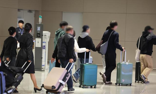 5日,在仁川国际机场第二航站楼,滞留中东的韩国旅客入境。美国和以色列日前对伊朗发动攻击,导致中东局势恶化。