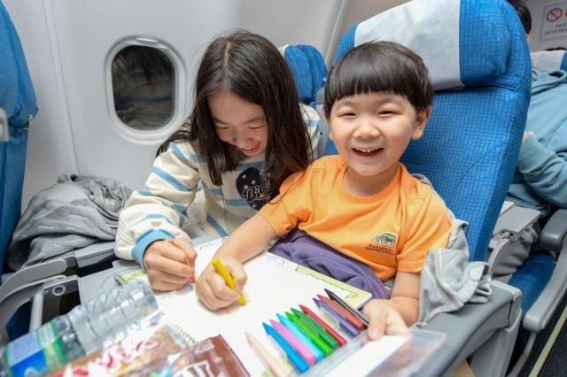 15日,搭乘韩国空军KC-330“西格纳斯”多用途空中加油机的儿童在机舱内画画。该机于当地时间14日下午从沙特阿拉伯首都利雅得起飞,执行撤离任务。