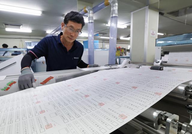 离大选还剩9天的25日,在京畿道安养市一家印刷厂,员工正在确认印刷中的第21届总统选举投票用纸。