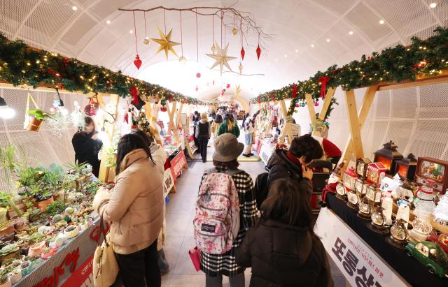 24日,在首尔广津区纛岛汉江公园J-Bug综合体周边及清潭桥下举行的“2025浪漫汉江圣诞市集”上,市民正在挑选各式圣诞商品。