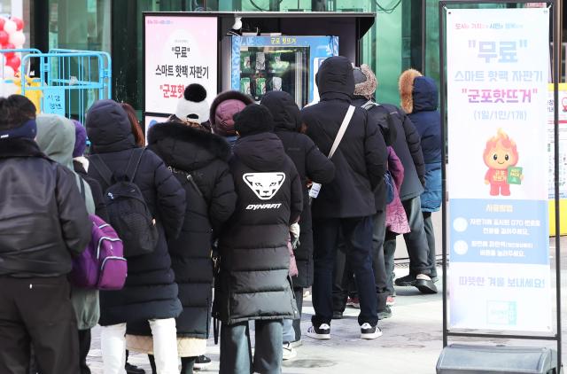 在持续寒潮的21日,位于京畿道军浦市的一处街边,智能暖宝宝自动售货机前,市民们为领取免费暖宝宝而排起了长队。