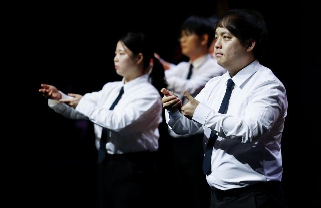 3日,在位于首尔西大门区的MODU艺术剧场举行的第六届韩国手语日纪念活动上,合唱团正在用手语演唱韩国国歌《爱国歌》。